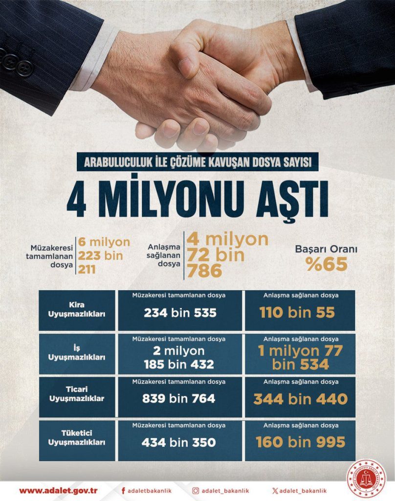 Arabuluculuk yoluyla sonlandırılan ihtilafların sayısının 4 Milyonu aştığı Adalet Bakanlığı tarafından yapılan duyuruyla ilan edildi. Başta işçiler ile işverenleri arasındaki uyuşmazlıklar olmak üzere, ticari uyuşmazlıkları(davaları), tüketici şikayetleri (uyuşmazlıkları) ve en son 1 Eylül 2023 itibariyle Kiracılar ile Ev sahipleri arasındaki uyuşmazlıkları çözüme kavuşturan arabuluculuk süreci büyük bir başarıya ulaştı. Arabuluculuk yoluna başvurulan dosyaların %65’inde taraflar, mahkeme sürecine gerek kalmadan, arabulucuların yardımıyla kendi aralarında anlaşarak uyuşmazlıklarını nihai çözüme kavuşturdu.